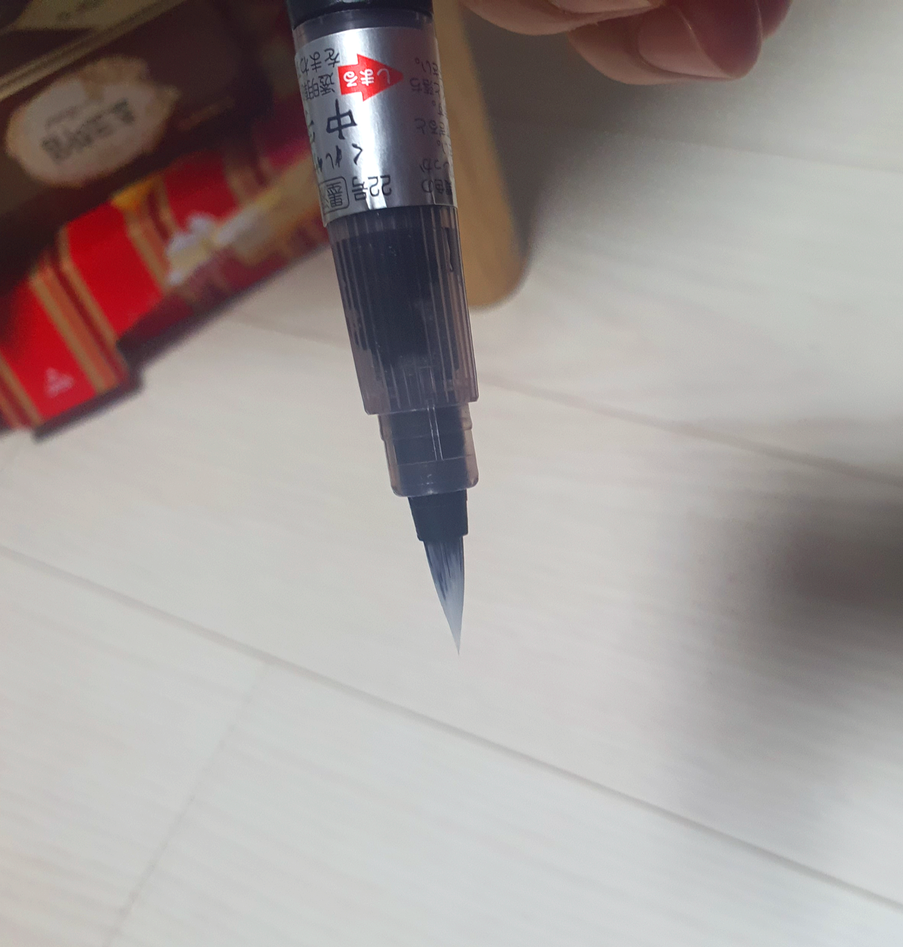 캘리그라피 완전 초보. 붓으로 연습하다 너무 힘들어서 바로 쿠팡으로 붓펜을 구입했다. 내가 상상했던 건 제사 지낼 때 쓰는 이미 촉촉해 져 있는 붓펜이었는데, 이 붓펜은 진짜 붓처럼 먹물이 붓으로 스며드는 형식이었다!! 짱 신기 ㅋㅋ