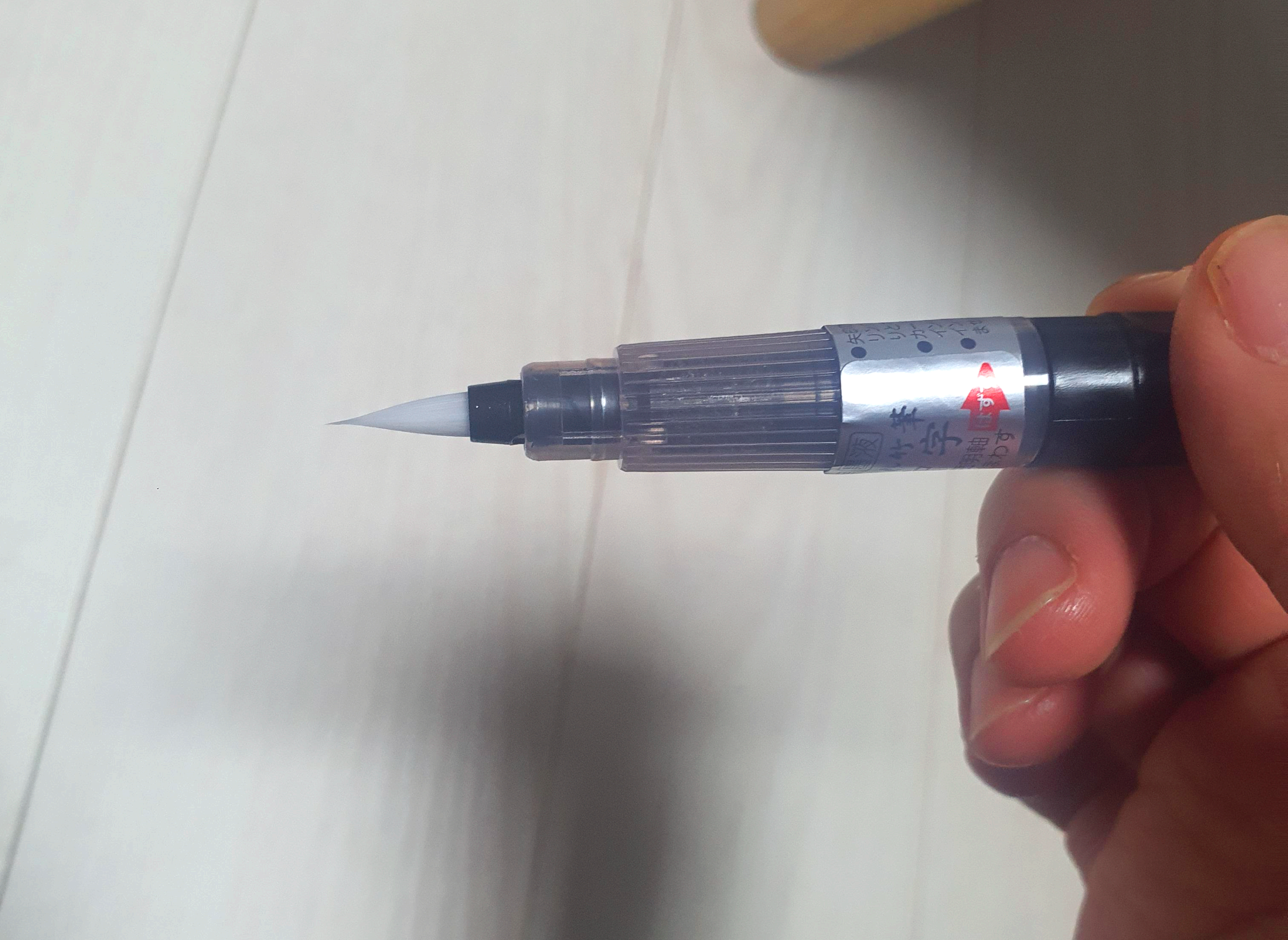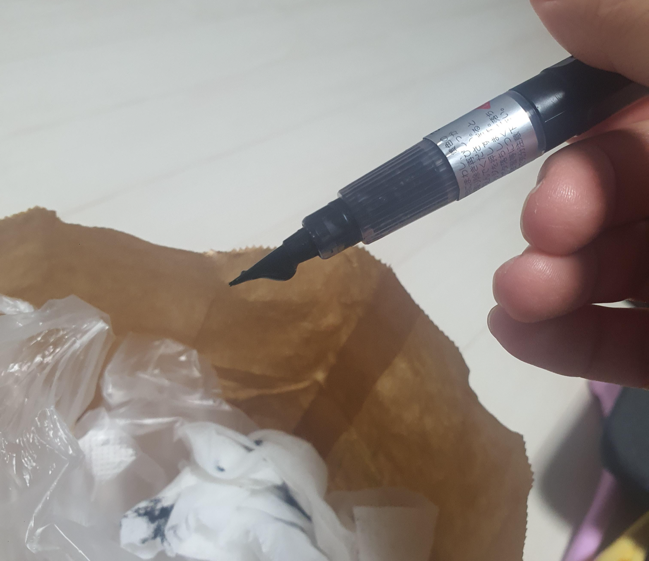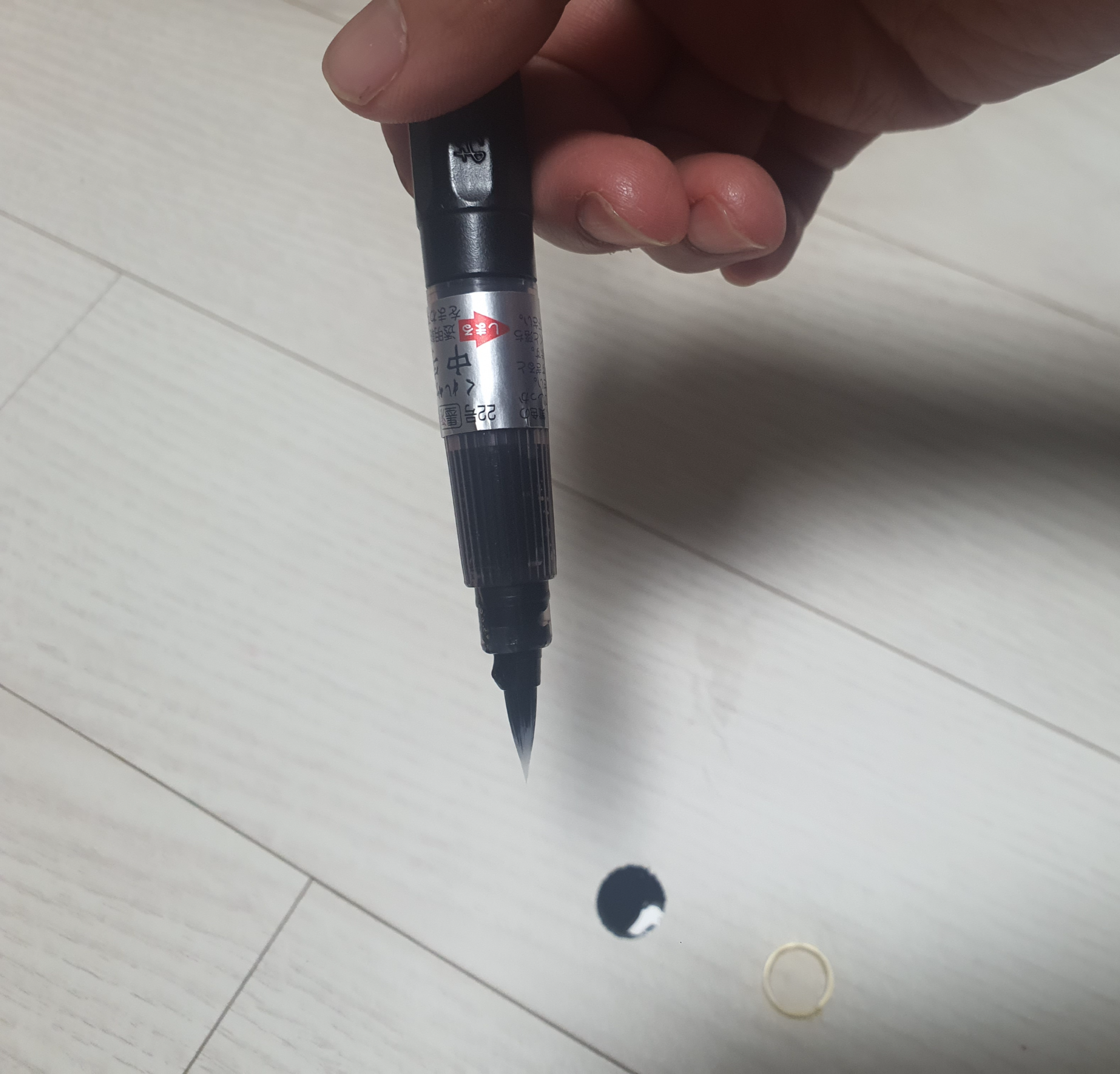 이렇게 하얗고 뽀얀 상태의 붓에서 분리 후 노란링을 제거하고 다시 합쳐준 후, 설명대로 눌러주면(구입할 때 상세설명에 나옴. 안 어려움) 먹물이 조금씩 나온다.