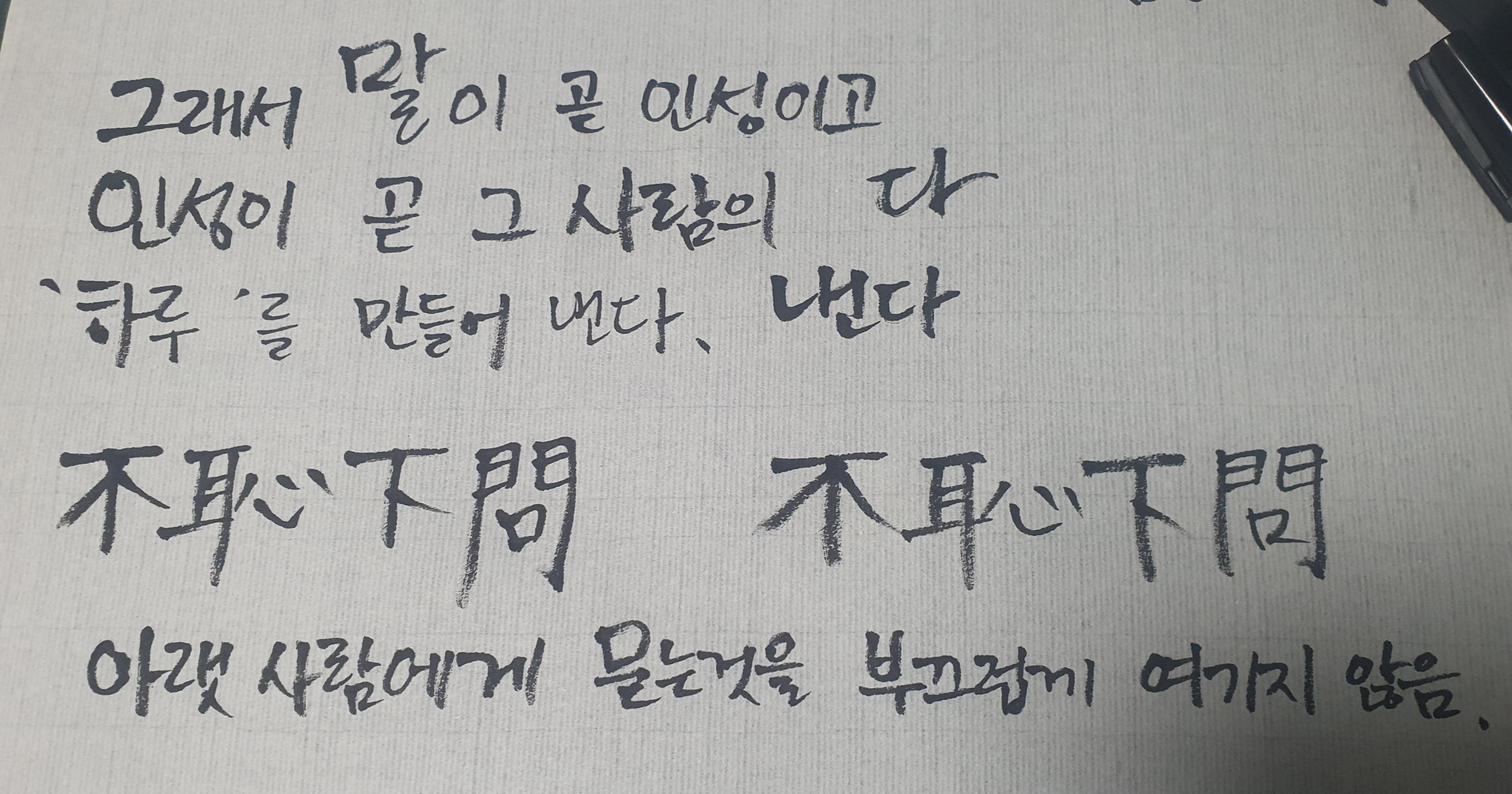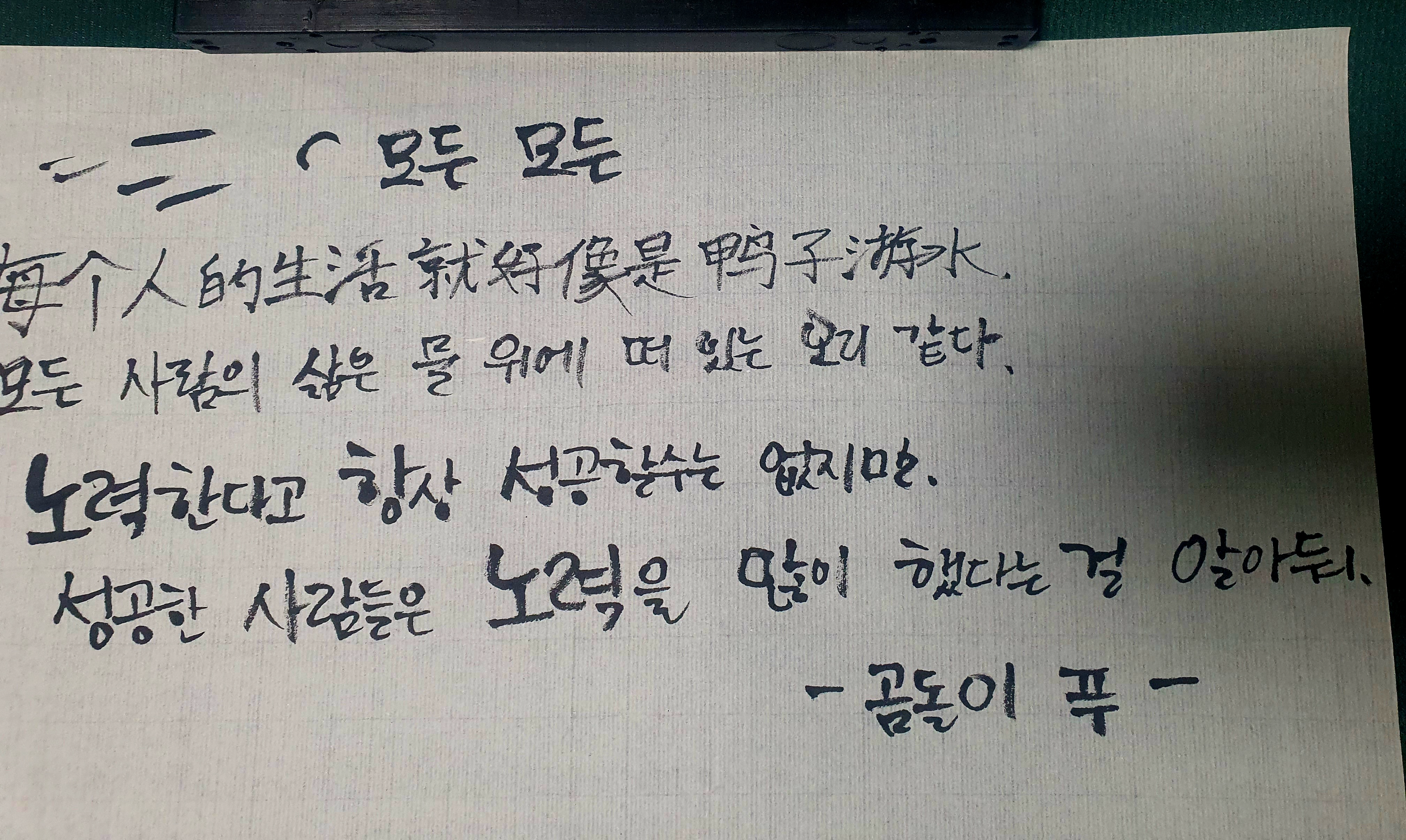 아직 먹물 조절에 익숙하지 않아서 선명도가 이랬다 저랬다 하지만 붓 보다 너무 편하다 ㅠㅠㅠㅠ 캘리 하시는 분들이 붓펜 많이 쓰실 것 같다. 그럼 붓은 언제 쓰는거지...ㅠㅠ