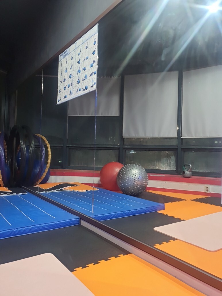 너무 제대로 서서 찍기엔 부끄러워서 앉은 자리에서 대략 찍어본 스트레칭 존 ..ㅋㅋ 넓은 편이다. 성인 4명이 동시에 해도 떨어져서 할 수 있음. 신경 안쓰임.